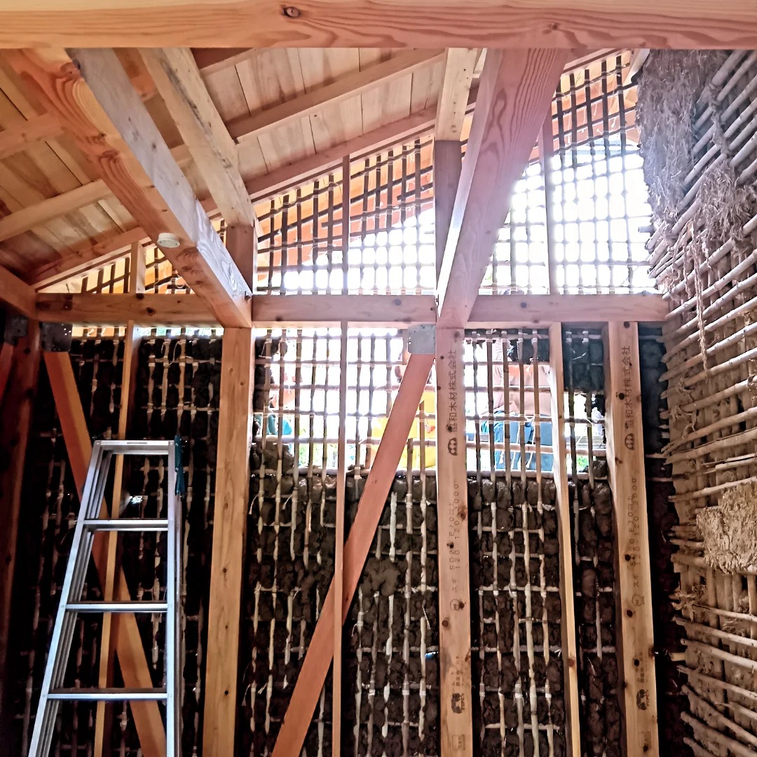 一番遅れている蔵の修繕は一番ベースの層となる荒壁を塗り終えました。乾燥後層を重ねて最終的に漆喰仕上げになります。茅葺き職人よりも貴重な土壁の左官職人さん。貴重な作業工程をみられる機会です。